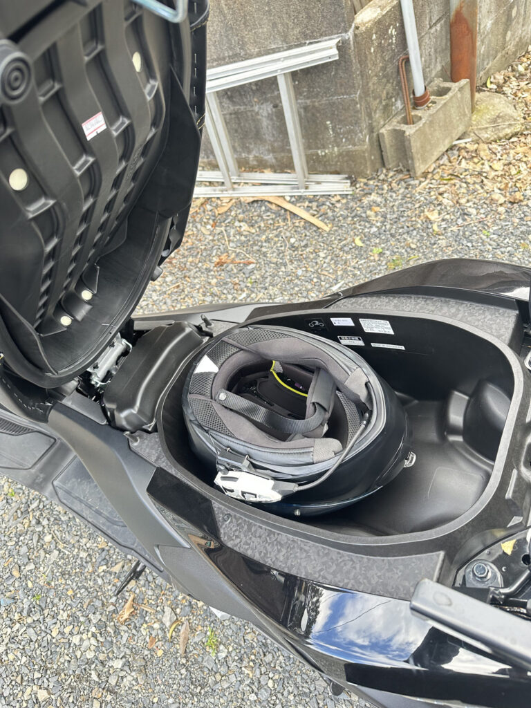 また、フルフェイスヘルメット(エアロブレード6・Lサイズ)は逆さにすることでメットインに収納できました。